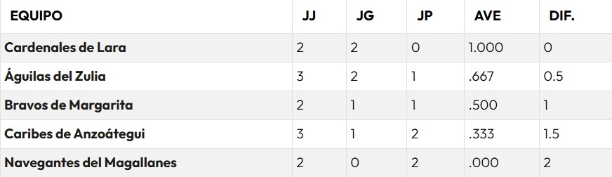 Tabla de posiciones en el Round Robin LVBP 2026